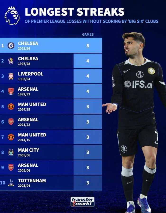 德转统计了英超Big6球队零进球连败排行榜。